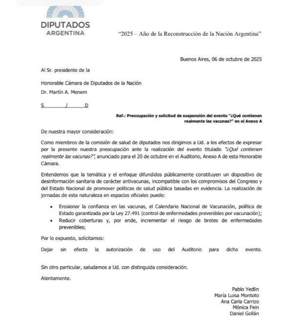 Ante esta convocatoria, legisladores de la Comisión de Salud enviaron una carta al presidente de la Cámara, Martín Menem, solicitando que no se autorice el uso del auditorio.