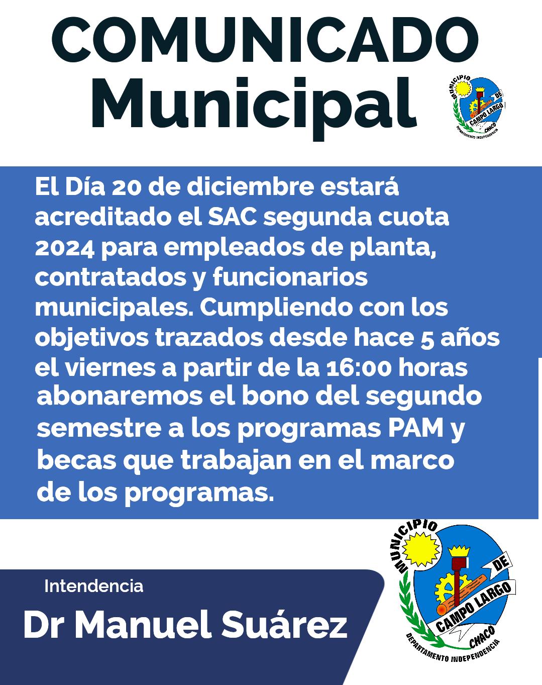 El día 20 de diciembre estará acreditado la 2º cuota Sueldo Anual Complementario ( AGUINALDO) para los empleados de planta permanente contratados y funcionarios del Municipio