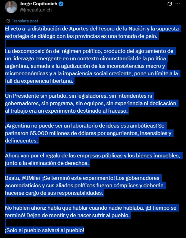 El veto a la distribución de Aportes del Tesoro de la Nación y la supuesta estrategia de diálogo con las provincias es una tomada de pelo.