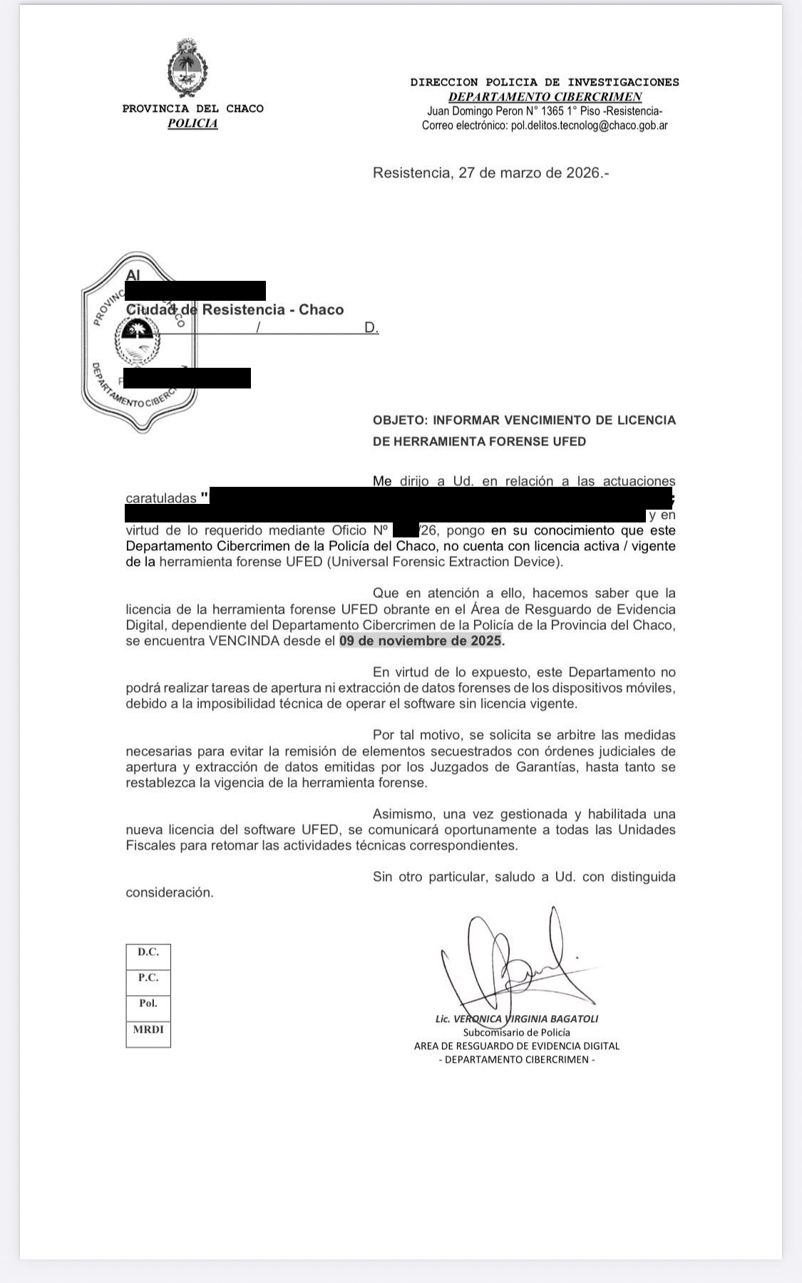 El hecho salió a la luz a partir de un pedido expreso de una fiscalía, que solicitó un informe sobre efectos secuestrados en el marco de una causa en trámite. En respuesta, la Subcomisario a cargo del área de resguardo de evidencia digital comunicó formalmente que no cuentan con una licencia vigente de la herramienta forense UFED, indispensable para este tipo de pericias.