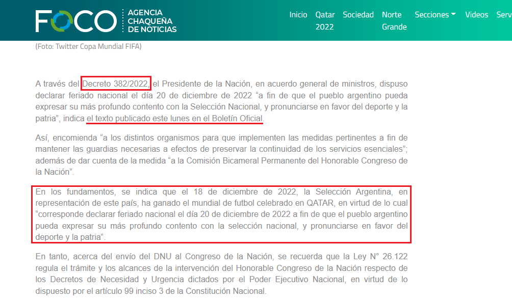 Tal decreto es de fecha 19 de diciembre y dice: Declárase feriado nacional el día 20 de diciembre de 2022 a fin de que el pueblo argentino pueda expresar su más profundo contento con la selección nacional y pronunciarse en favor del deporte y la patria. Tan burdo el error que uno de los firmantes del decreto es Juan Zabaleta quien es de público conocimiento que ya no se encuentra en el gabinete nacional
