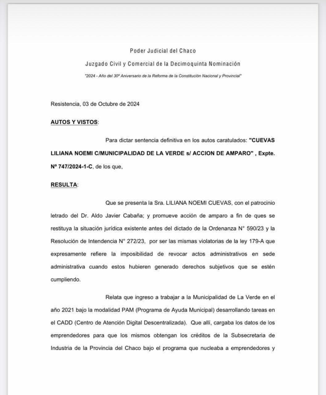 El Municipalismo por sobre todas las cosas sostuvo el Dr. Aldo Cabaña al comentar el fallo del juzgado civil y comercial de la décimo quinta nominación que hizo lugar a la acción de amparo que promoviera Cuevas Liliana contra la Municipalidad de La Verde.