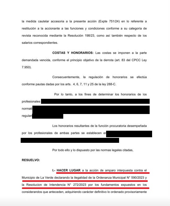 Se hizo lugar a la acción de amparo y se declaró la ilegalidad de la Ordenanza municipal 590/23 y de la resolución de intendencia 272/23 y restituyendo definitivamente a Cuevas a la categoría que revestía como agente de planta permanente.