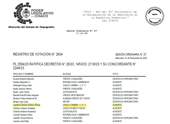 Cabe recordar que la Diputada Cantero Reiser no dio cuórum en la Sesión del 01/Noviembre del 2023 que trataba el pase a planta de los trabajadores del estado provincial , claro que otros no pasen a planta pero ella si pide el suyo