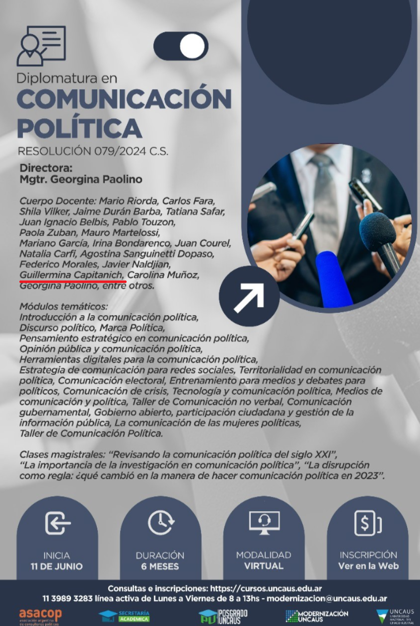 La casa de altos estudios lanzó la Diplomatura en Comunicación Política un Curso con una duración de seis meses, modalidad virtual y con un costo de $ 150.000.-