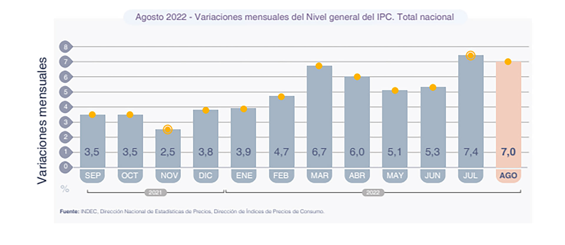 De esa manera, el IPC mostró una baja respecto de julio, cuando el aumento llegó a 7,4%, el más alto en 20 años. Sin embargo, el registro del mes pasado muestra que el índice ya acumula seis meses por encima del 5% mensual . Y que el Gobierno, con cambios en el Gabinete -como el emblemático ingreso de Sergio Massa como ministro de Economía- y una mentada “guerra” que lanzara Alberto Fernández (en marzo) no puede bajar la inercia inflacionaria.