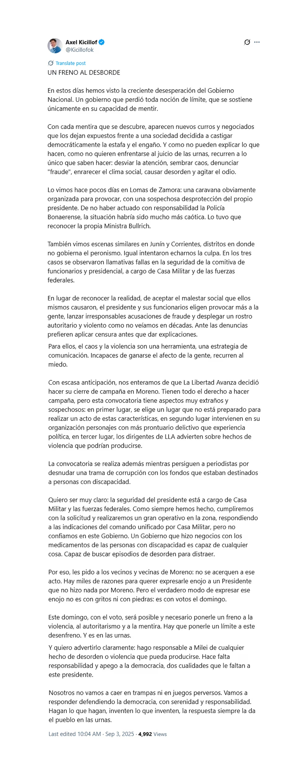 El gobernador de la provincia de Buenos Aires, Axel Kicillof, difundió una carta pública con duras críticas al presidente Javier Milei mediante la cual lo hizo responsable de cualquier hecho de desorden o violencia que pudiera producirse esta tarde, en Moreno, en el acto de cierre de campaña convocado por la Libertad Avanza.