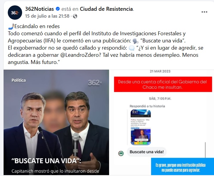 El portal 362 Noticias levanto una captura de la cuenta del ex gobernador donde titula. Escándalo en redes