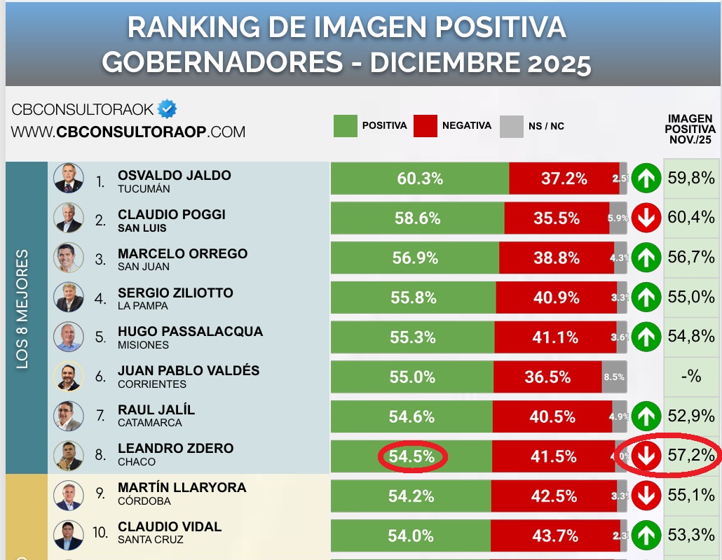 Un informe reciente de la consultora CB revela un marcado retroceso en la imagen positiva del gobernador del Chaco, Leandro Zdero. En apenas un mes descendió cuatro posiciones en el ranking nacional, con aumento de la imagen negativa y del porcentaje de indecisos.