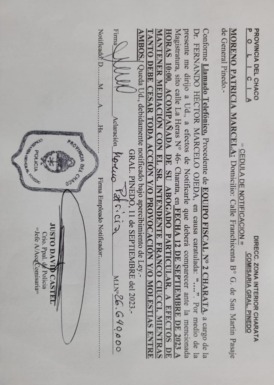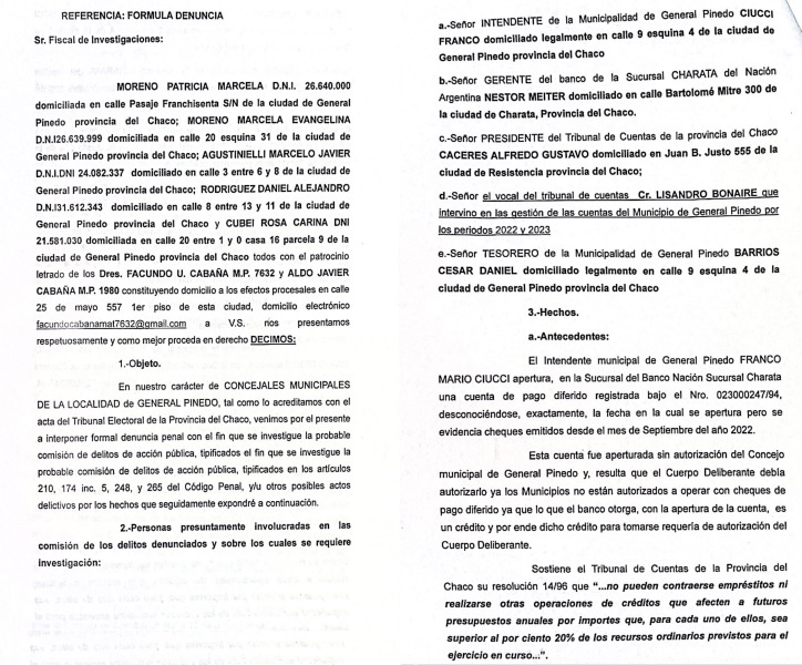El día 25 de agosto del 2023, un grupo de concejales acompañados por la Presidenta del Consejo de la Ciudad de General Pinedo, se hicieron presente en la Mesa Única de Intervención Temprana (MUIT) a los fines de realizar la denuncia; recayendo la misma en la Fiscalía de Investigaciones Nº 3 a cargo del Dr. Fernando Héctor Marcelo Ojeda.