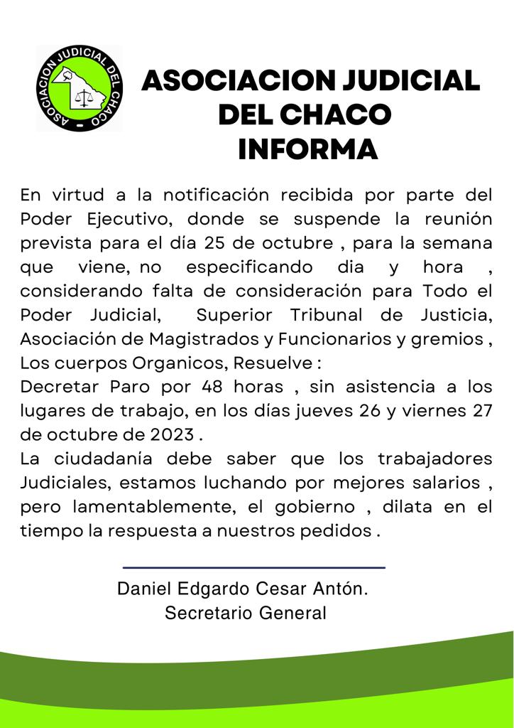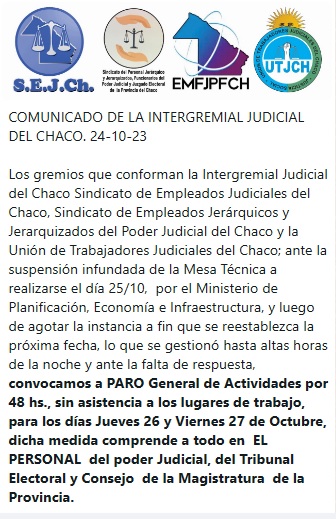 A posteriori, desde la Intergremial Judicial que manifestaban estar en desacuerdo con las medidas de fuerza apostando a ver si conseguían acordar, fueron otra vez burlados por el Ejecutivo Provincial y hoy lanzan un comunicado convocando a un paro de actividades ya convocado por la Asociación Judicial del Chaco, y que lo lógico sería que comenzaran sus agremiados con un paro de 24 hs.