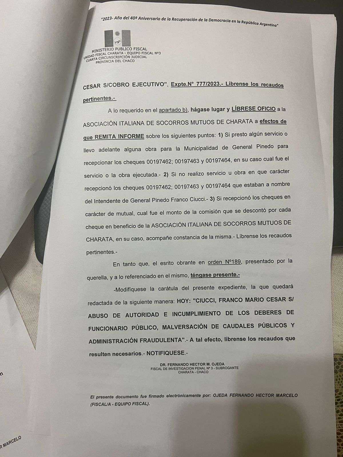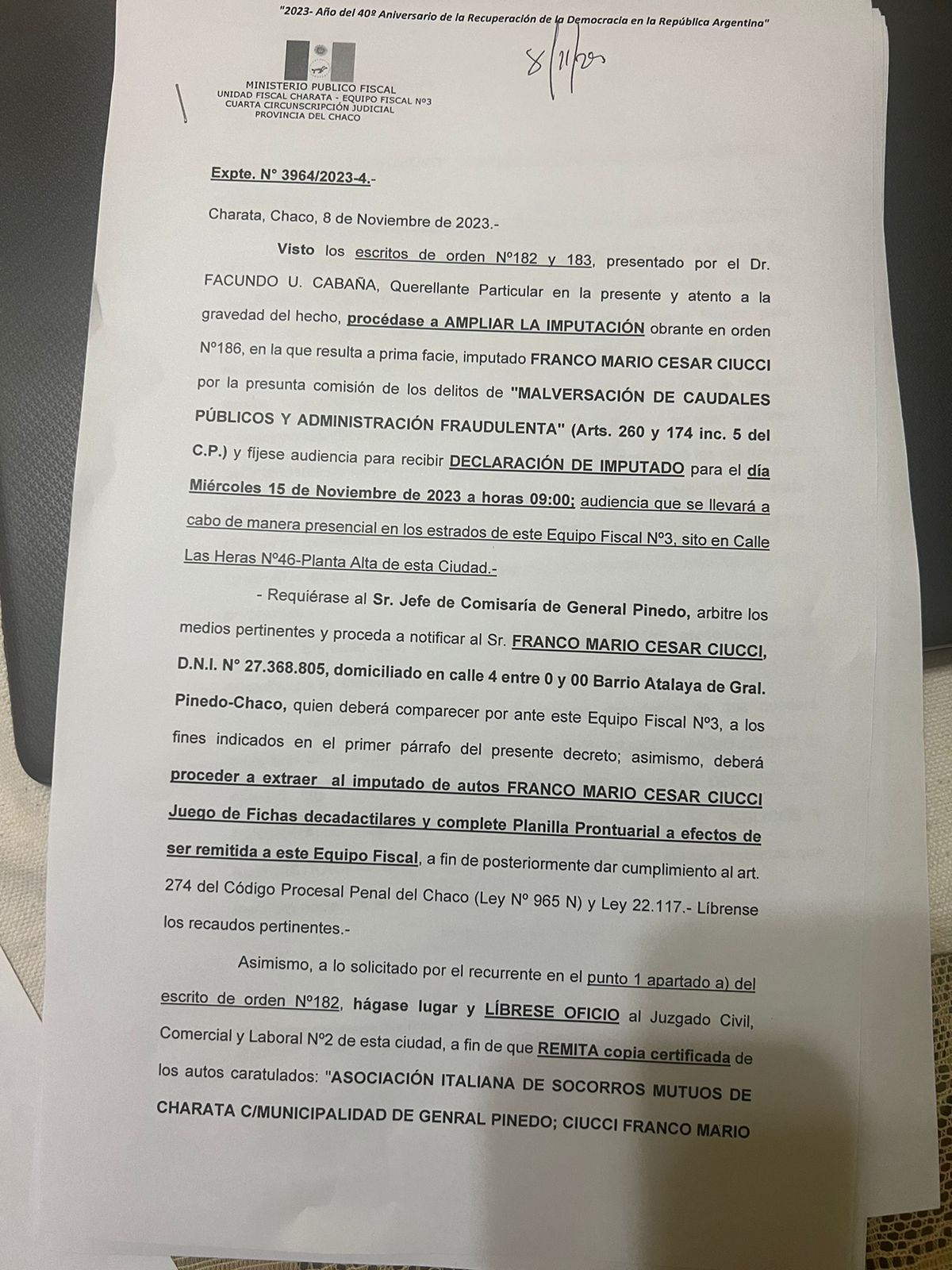 Posterior a la primera imputación del día 07 de noviembre de 2023 el Dr. Fernando Héctor M. Ojeda Fiscal De Investigación Penal Nº 3 –Subrogante, de la Ciudad de Charata mandó un oficio a la comisaría de Gral. Pinedo y ordenó su comparecia y manchar sus dedos con tinta