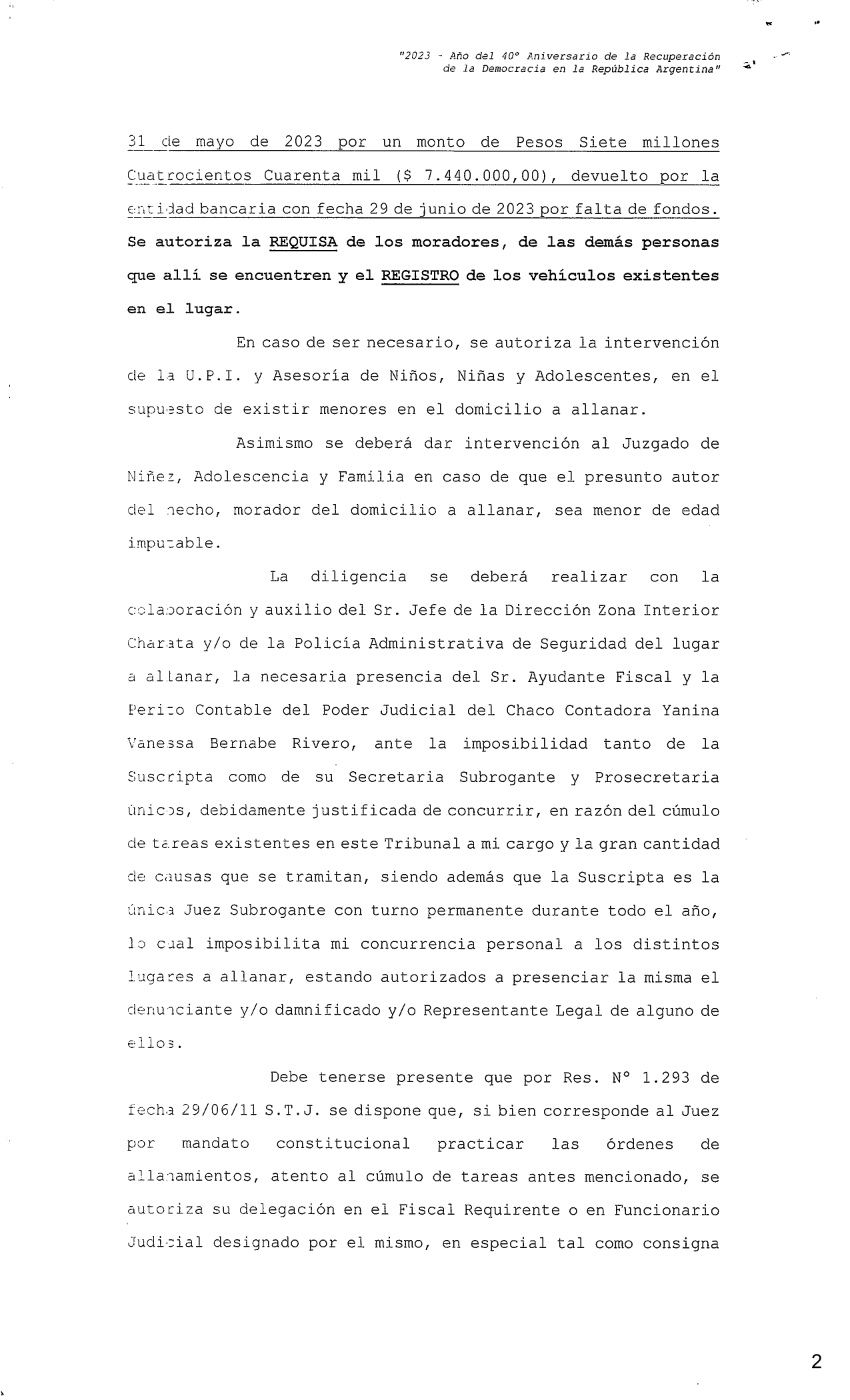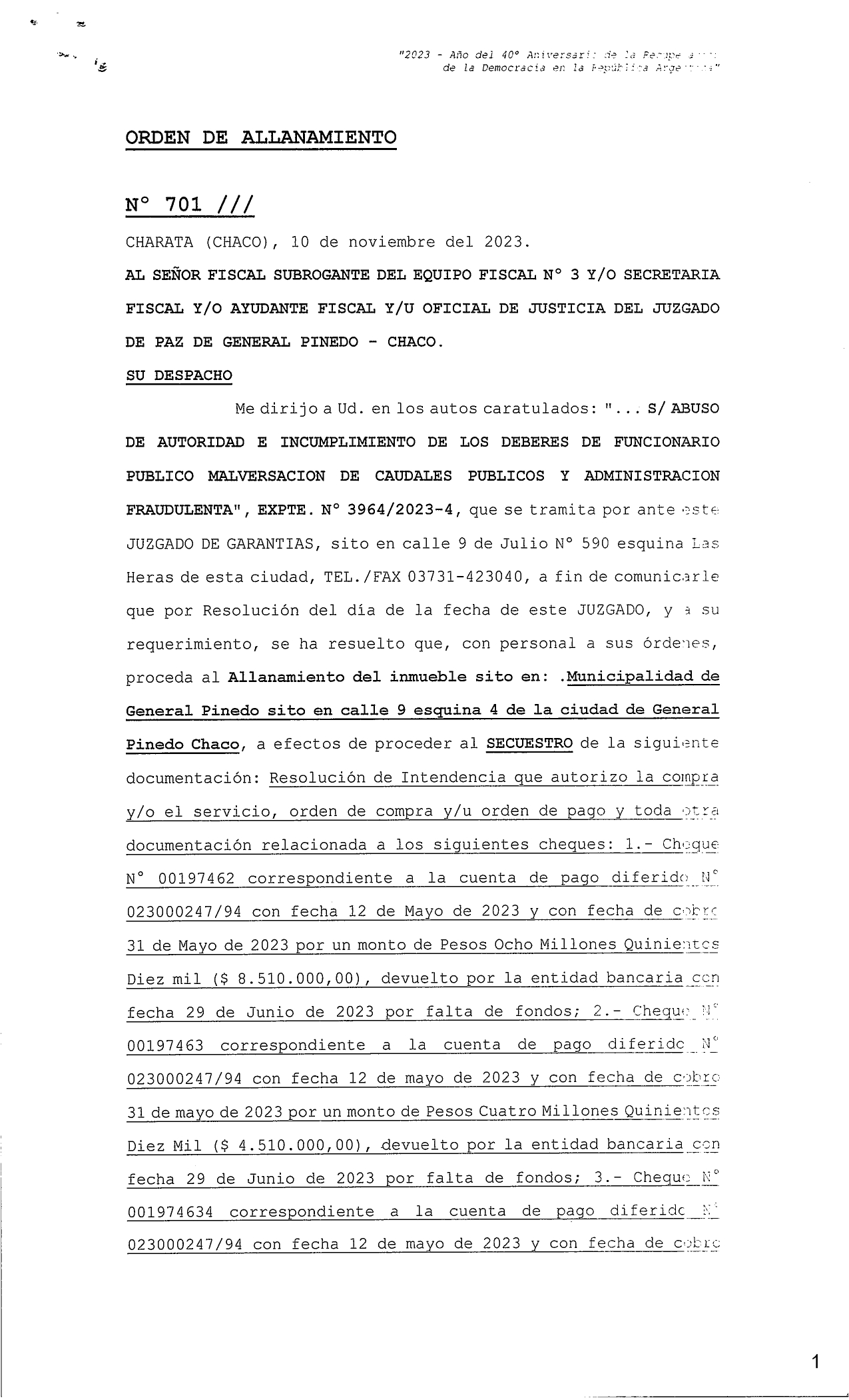 Sin Filtro accedió al informe del allanamiento realizado en la Municipalidad de General Pinedo ordenado por la Dra. Gómez Gabriela Alejandra (Jueza del Juzgado de Garantías de la Ciudad de Charata).
