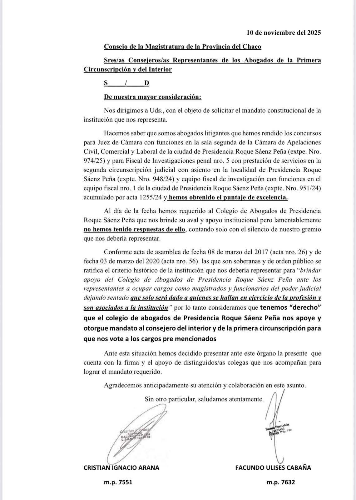 Sin embargo, lejos de encontrar un acompañamiento claro, transparente y ajustado a derecho por parte de la institución que debería defenderlos, el Colegio de Abogados de la Segunda Circunscripción Judicial, con sede en Presidencia Roque Sáenz Peña, incurre en una conducta grave: retiene, dilata y omite otorgar el mandato que legal y éticamente corresponde al representante de los abogados del interior ante el Consejo de la Magistratura.